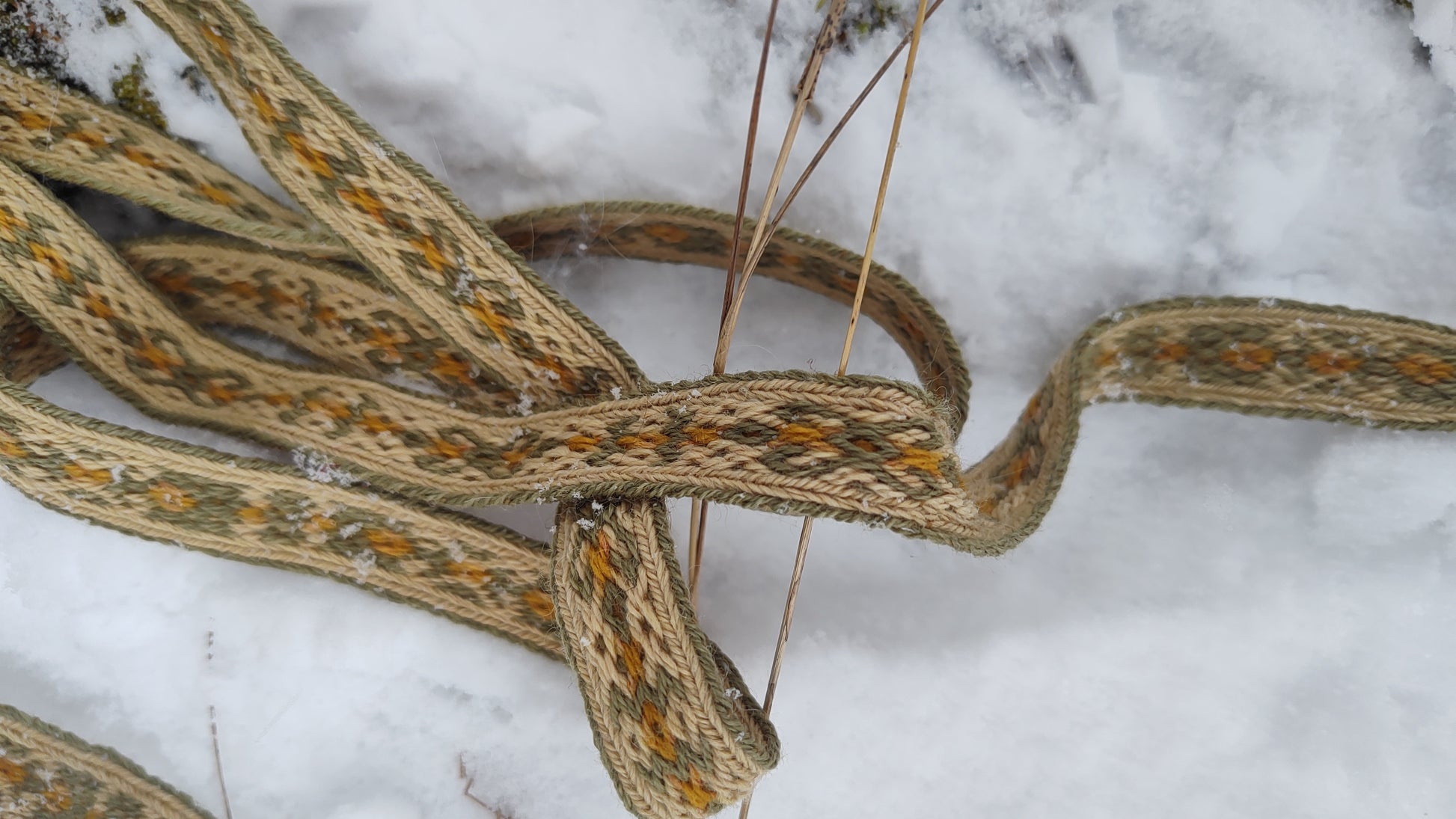 This decorative band is handwoven on tablets using fine Norwegian wool I dyed myself. The contrast is quite subtle and it fits medium status persona.