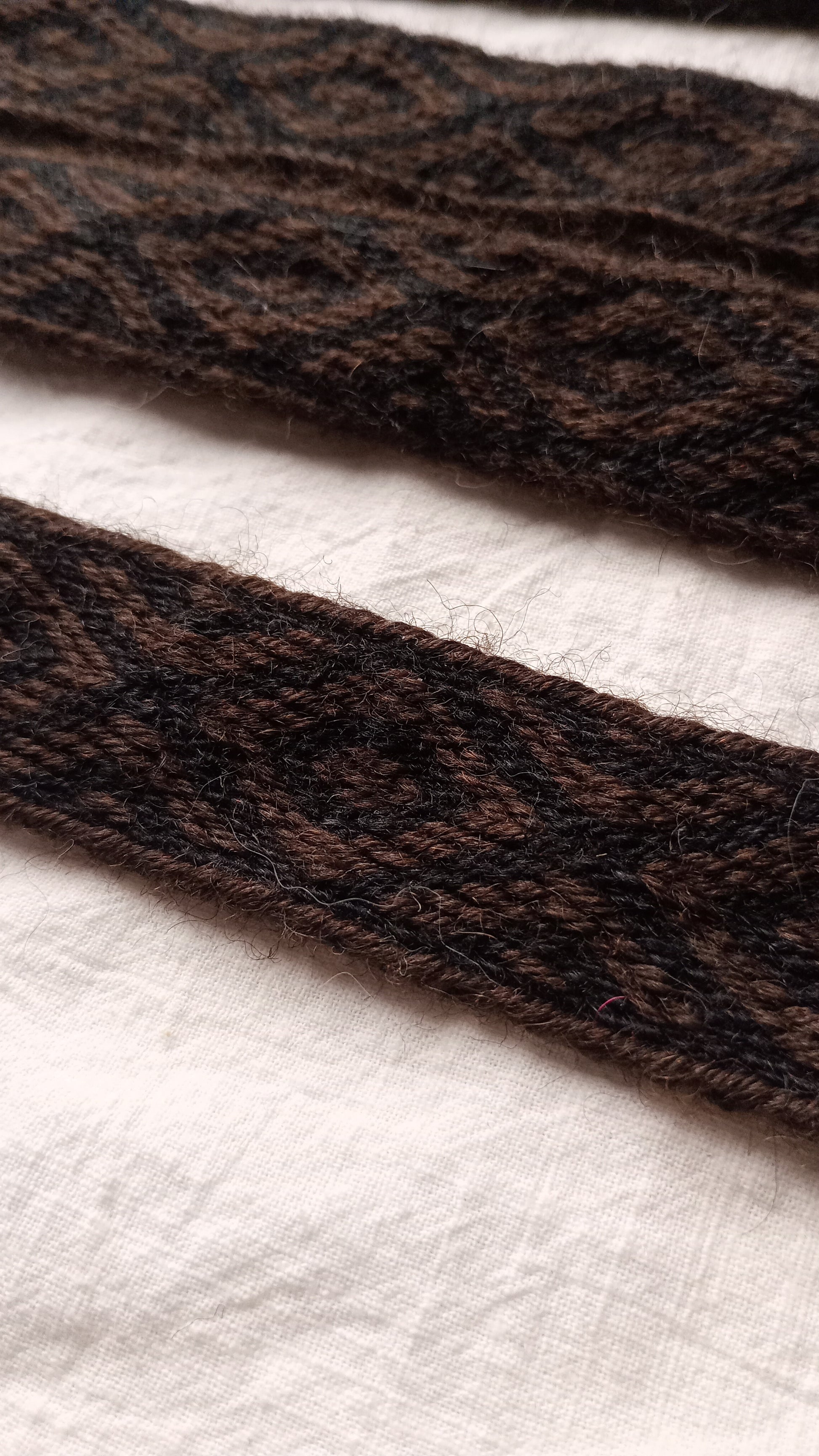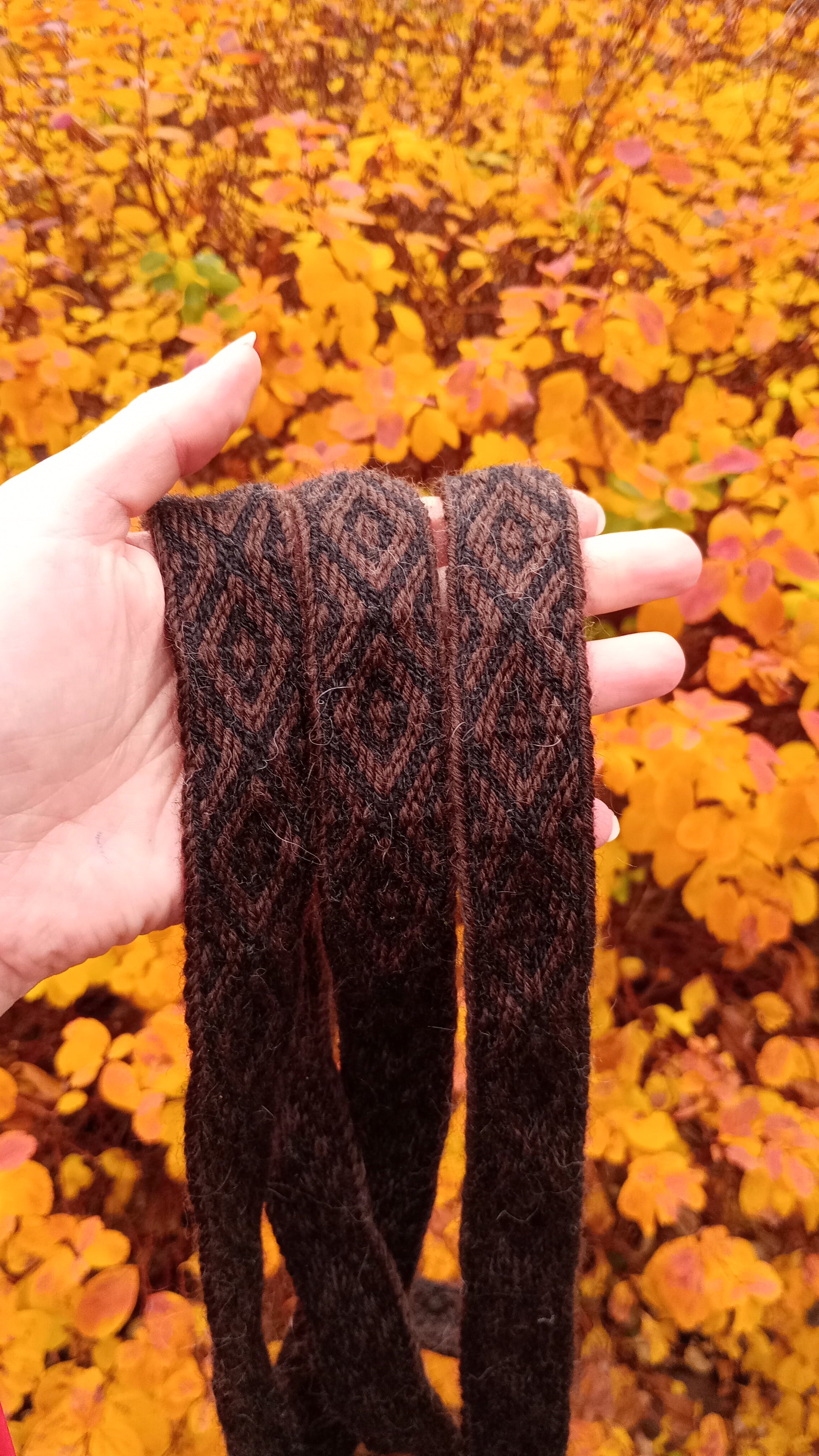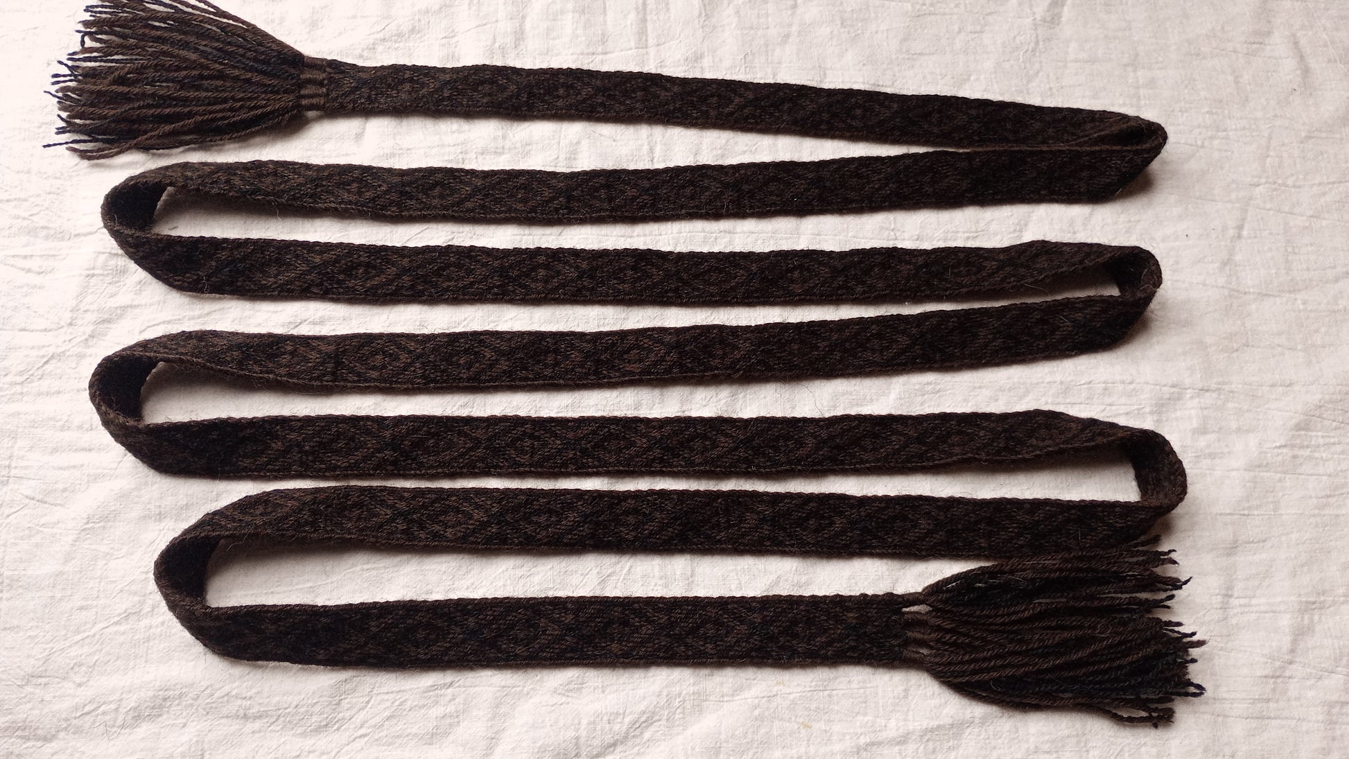 This belt with diamonds pattern is made of Norwegian produced wool. It is durable and soft. Ends are finished by a simple tassels.